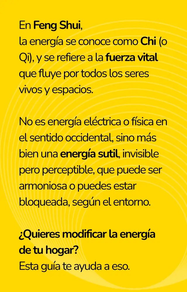 la energía se conoce como Chi (o Qi), y se refiere a la fuerza vital que fluye por todos los seres vivos y espacios.
